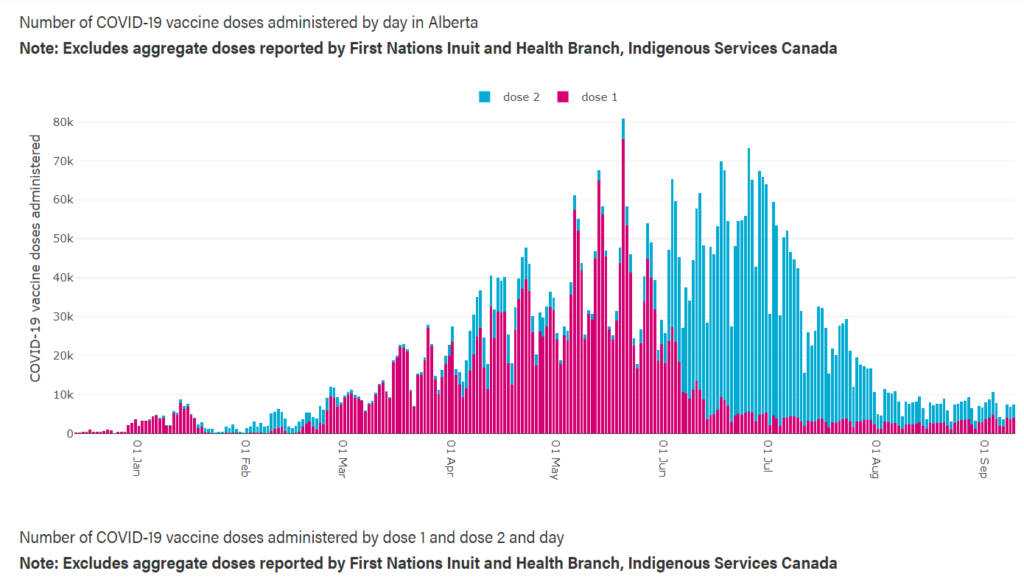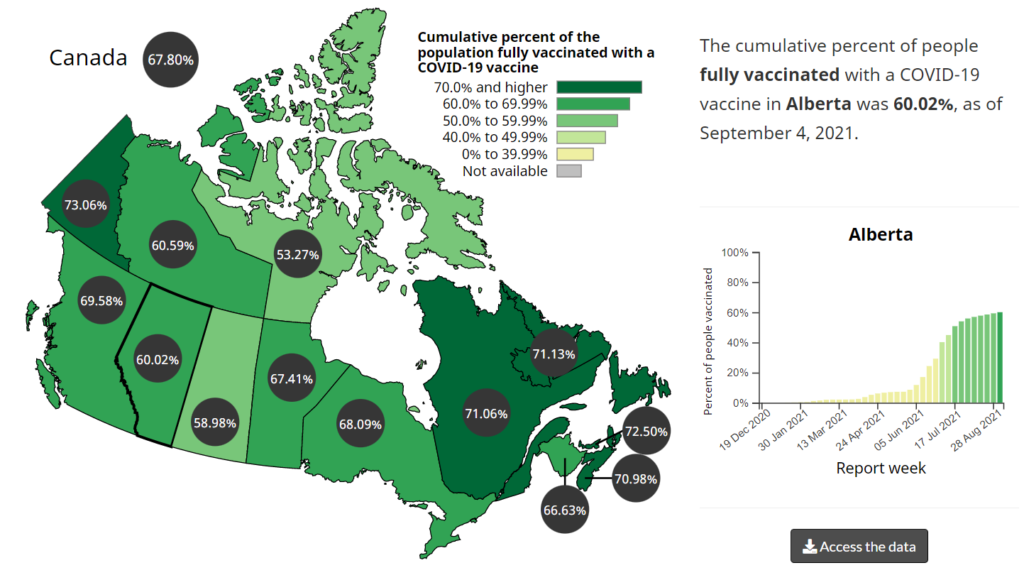 In early September 2021, COVID-19 cases in Alberta surged beyond 1000 per day, overwhelming hospitals and emergency rooms across the province. No doubt, this was related to Alberta’s relatively low vaccination rate. As of September 4, only about 60.2% of Albertans were fully vaccinated, ahead of only Saskatchewan (59%) and far behind Ontario (68.1%), Quebec (71%), and the Canadian leader Yukon Territory (73%). You go Yukon!