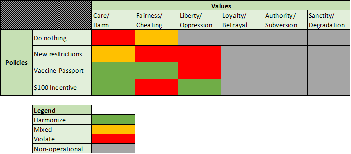 Like the new restrictions option, the implementation of a vaccine passport system harmonizes with the Care value. The unvaccinated will have less ability to enter shared spaces, reducing their capacity to pass on the virus. This policy option also harmonizes with the Fairness value. Only individuals who refuse vaccination will experience restrictions, which clearly aligns actions and consequences.
